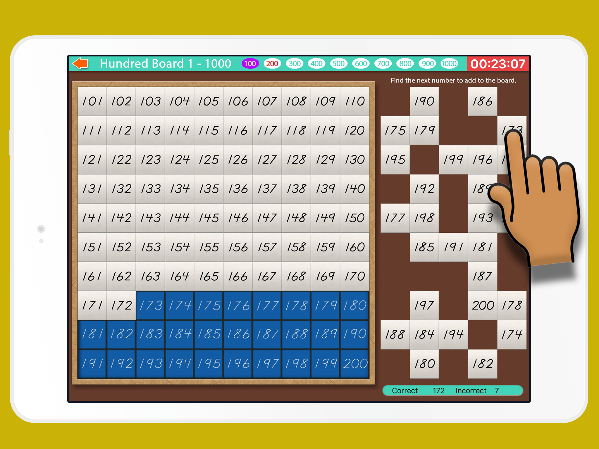 This follow-up app allows children to practice counting from 1 up to 1000! You can choose to see the control numbers on the board for assistance, and if you want to use the "touch only" or "drag and place method" for placing the number tiles onto the board.